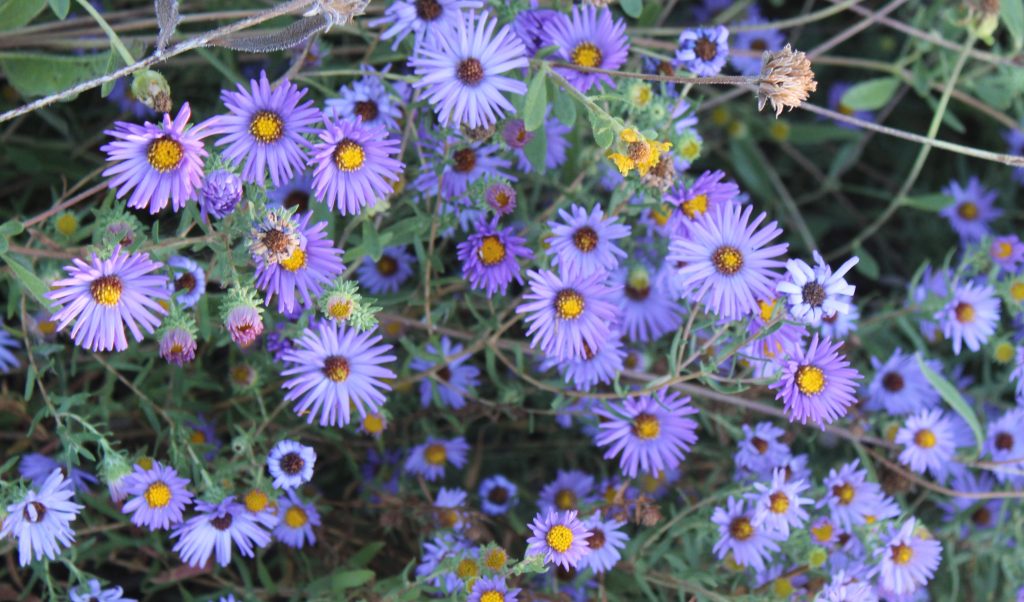 Asters are part of the much larger Aster family, which includes Sunflowers, Daises, Dandelions and many others. The fascinating thing about most plants in this family is that each individual flower is composed of two different kinds of flowers–the ones that look like petals around the outside and the tiny ones that together make up the central eye. Next time you see an Aster, take a close look and see if you can see the mini-flowers in the middle.